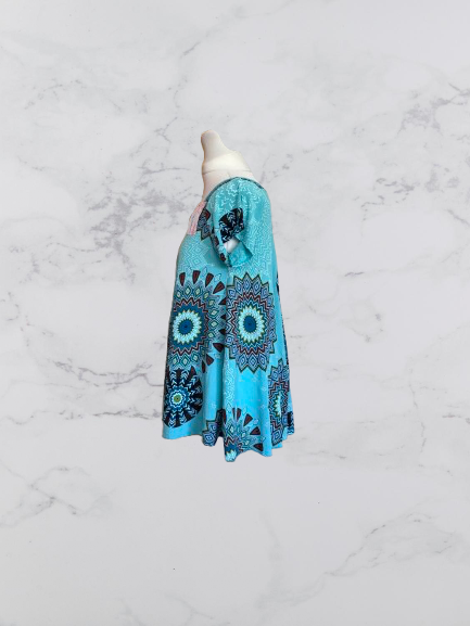 Add a touch of boho charm to your everyday wardrobe with this flowy printed top. Featuring an aqua base with intricate mandala-inspired patterns, this piece is perfect for those who love statement prints with an effortless silhouette. The soft fabric drapes beautifully, while the scoop neckline and short sleeves keep it easy and flattering. Style with jeans for a casual day look or pair with leggings for relaxed weekend vibes.