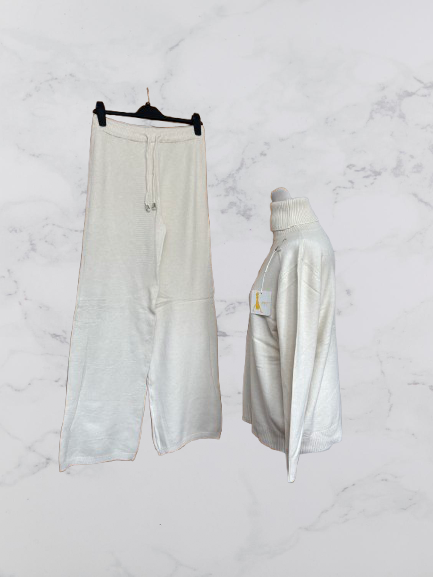 Elevate your off-duty style with this effortlessly chic roll neck lounge set. Designed in a soft cream knit, this two-piece ensemble features a relaxed roll neck jumper with ribbed trims and matching wide-leg lounge pants with a comfortable drawstring waist. Perfect for cosy days at home or styled up for casual outings, this set blends comfort with understated elegance. A timeless staple for your wardrobe, offering both warmth and style.