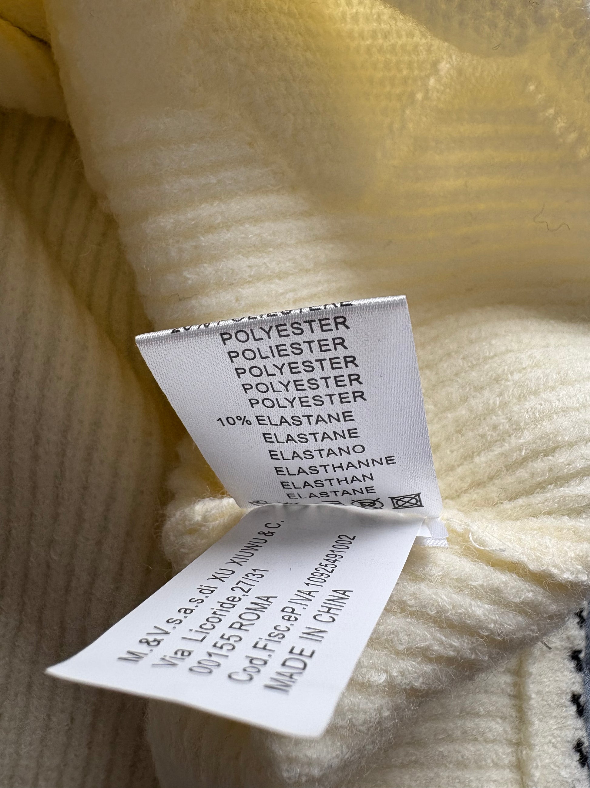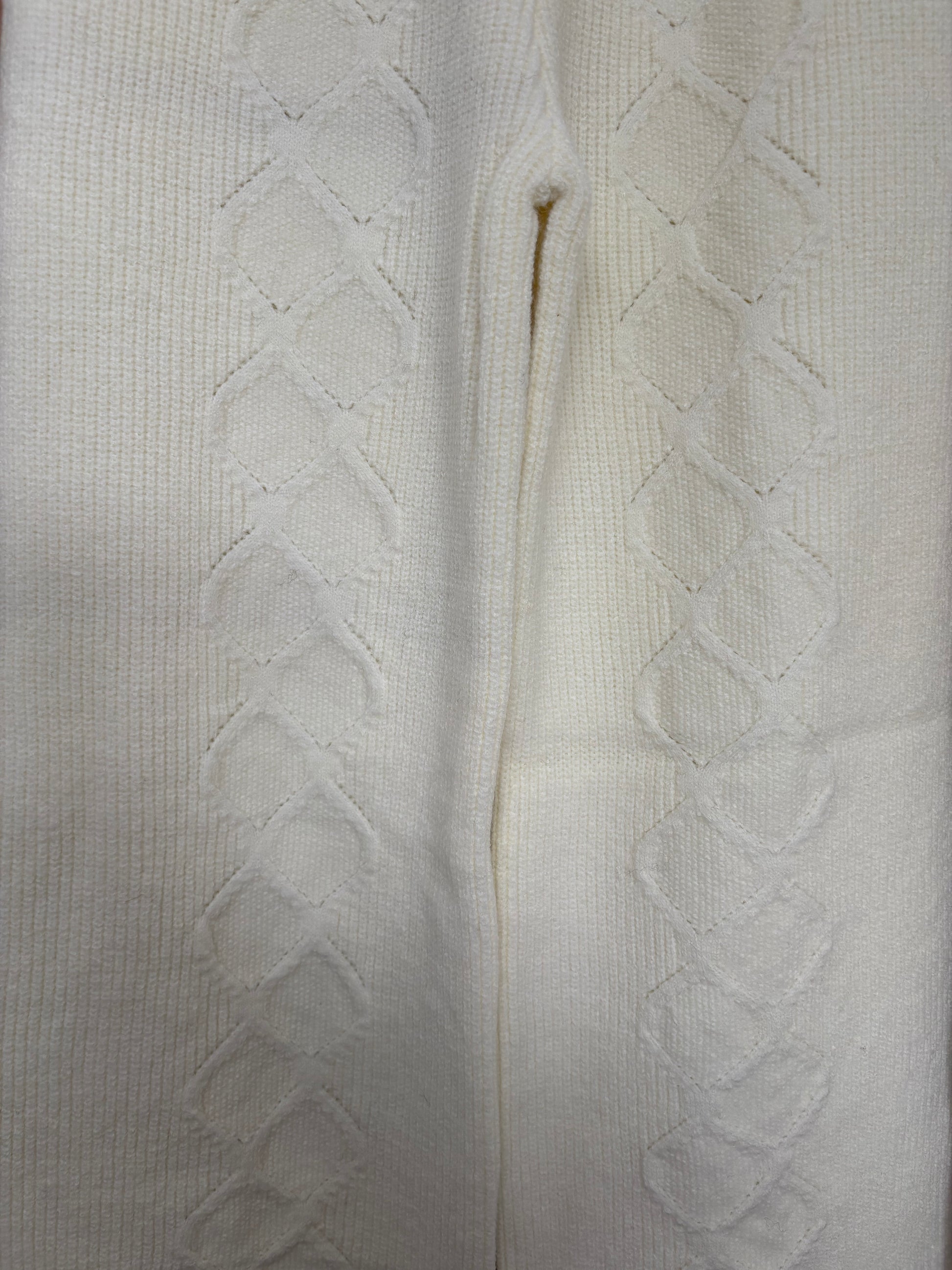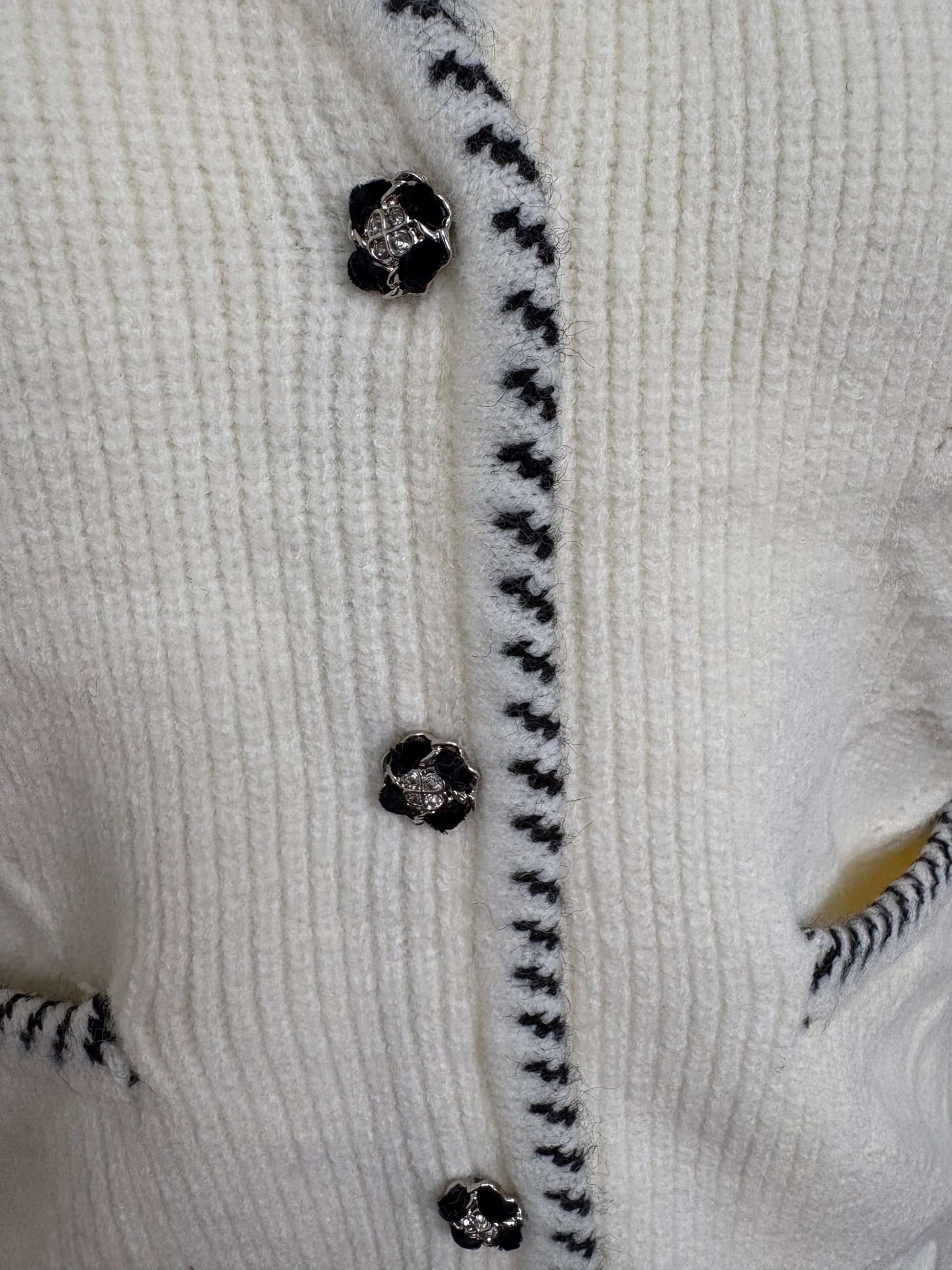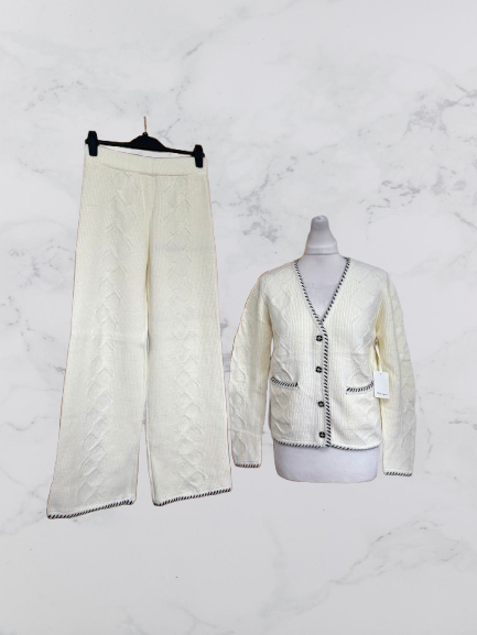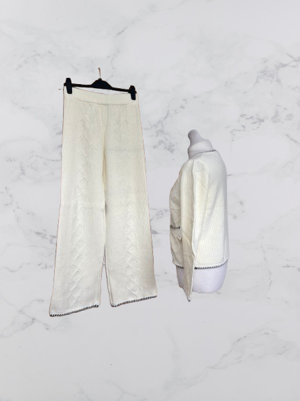 Elevate your off-duty style with this chic knitted lounge set, designed for both comfort and elegance. Crafted in a soft cream knit with subtle cable detailing, the set features wide-leg trousers and a matching button-front cardigan. Contrast black stitching along the hem, cuffs, and neckline adds a modern edge to this timeless design.